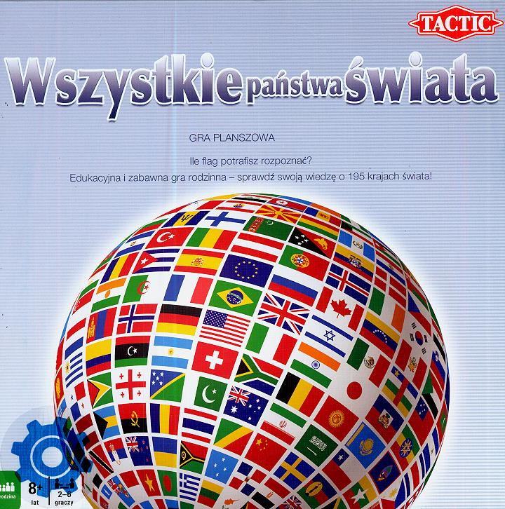 Wszystkie państwa świata : gra planszowa : ile flag potrafisz rozpopznać? : edukacyjna i zabawna gra rodzinna - sprawdź swoją wiedzę o 195 krajach świata! - Pori : Tactic Games Oy, ©2014. - 1 gra (wiele elementów) : karton, plastik, kolor ; w pudełku 6x25x25 cm + instrukcja ([2] strony : ilustracje ; 24 cm).